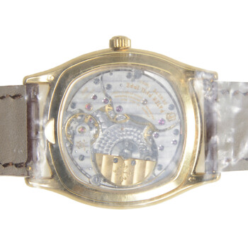18kt yellow gold case with a brown alligator leather strap. Fixed 18kt yellow gold bezel. Cream dial with gold-tone leaf-style shape hands and Arabic numeral hour markers. Minute markers around the outer rim. Dial Type: Analog. Month, day, date. Three combination sub-dials displaying: day and 12 hours, month and leap year, and date and moonphases subdials. Patek Philippe Calibre 240 Q Automatic movement, containing 27 Jewels, composed of 275 parts, bitting at 21600 vph, and has a power reserve of approximately 48 hours. Scratch resistant sapphire crystal. Transparent sapphire case back. Cushion case shape. Case size: 44.6 mm x 37 mm. Tang clasp. Water resistant at 30 meters / 100 feet. Functions: leap year, month, date, day, hour, minute, second, moonphase, GMT, perpetual calendar, grand complication. Luxury watch style. Watch label: Swiss Made. Item Variations: 5940J 001, 5940J.001, 5940J001. Patek Philippe Grand Complications Mechanical Cream Dial Men's Watch 5940J-001.