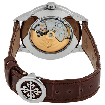 18kt white gold case with a shiny chocolate brown alligator leather strap. Fixed bezel. Rose-gilt opaline dial with charcoal gray hands and Arabic numeral hour markers. Dial Type: Analog. Luminescent hands and markers. Date display between 4 and 5 o'clock position. One subdial displaying: one- date (inner moon phases). Patek Philippe Calibre 26-330 S Q Automatic movement, containing 29 Jewels, composed of 367 parts, bitting at 28800 vph, and has a power reserve of approximately 45 hours. Scratch resistant sapphire crystal. Transparent see through case back. Round case shape, case size: 40 mm, case thickness: 11.13 mm. Water resistant at 30 meters / 100 feet. Functions: date, hour, minute, second, perpetual calendar, day/night indication. Grand Complications Series. Luxury watch style. Watch label: Swiss Made. Patek Philippe Grand Complications Perpetual Automatic Men's Watch 5320G-011.