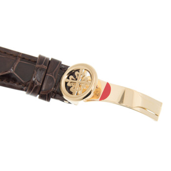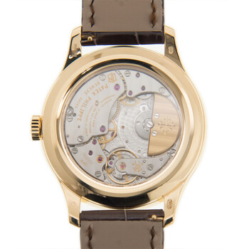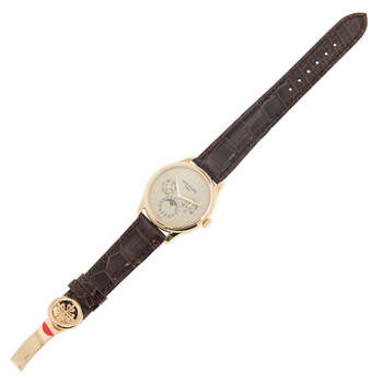 18k yellow gold case with a brown leather strap. Fixed 18k yellow gold bezel. White dial with gold-tone leaf-style shape hands and Arabic numeral hour markers. Minute markers around the outer rim. Dial Type: Analog. Date display at the 6 o'clock position. Three- date (inner moonphase), month, day of the week (inner leap year) subdials. Patek Philippe Calibre 240 Q Automatic movement, containing 27 Jewels, composed of 275 parts, bitting at 21600 vph, and has a power reserve of approximately 48 hours. Scratch resistant sapphire crystal. Skeleton transparent exhibition see through case back. Round case shape, case size: 39 mm, case thickness: 9.71 mm. Slip through buckle clasp. Water resistant at 30 meters / 100 feet. Functions: leap year, month, date, day, hour, minute, second, moonphase, GMT, perpetual calendar, grand complication. Additional Info: unsuitable for prolonged contact with water e.g. swimming, bathing. Luxury watch style. Watch label: Swiss Made. Patek Philippe Grand Complications Perpetual Automatic White Dial Men's Watch 5327J-001.