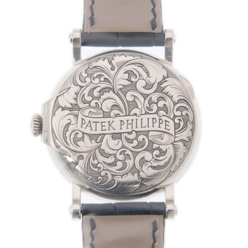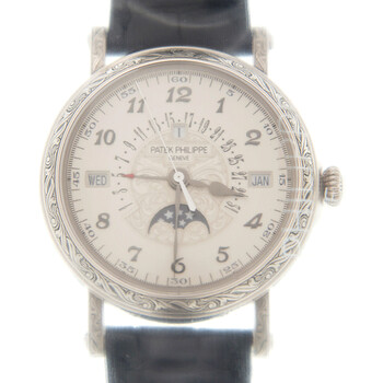 18kt white gold case with a black alligator leather strap. Fixed gold-tone 18kt white gold bezel. White dial with black spade-shaped hands and Arabic numeral hour markers. Minute markers around the outer rim. Dial Type: Analog. Perpetual calendar. One - moon phase subdial. Patek Philippe Calibre 324 S QR Automatic movement, containing 30 Jewels, composed of 361 parts, bitting at 28800 vph, and has a power reserve of approximately 45 hours. Scratch resistant sapphire crystal. Screw down crown. Solid case back. Round case shape. Case size: 38 mm. Deployment clasp. Water resistant at 30 meters / 100 feet. Functions: perpetual calendar, moon phase, leap year, date, day, hour, minute, second. Additional Info: original box, international warranty card, manual (complete accessories). Luxury watch style. Watch label: Swiss Made. Patek Philippe Grand Complications Perpetual Automatic White Dial Watch 5160-500G-001.