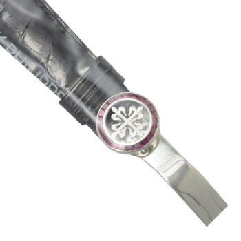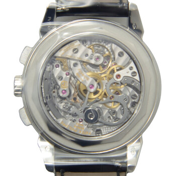 Silver-tone platinum case with a black alligator band. Fixed silver-tone platinum bezel. Black dial with silver-tone hands and index hour markers. Minute markers around the outer rim. Dial Type: Analog. Perpetual calendar. Three sub-dials displaying: 60 second, 30 minute and date/moonphase. Patek Philippe Calibre CH 29-535 PS Q Hand Wind movement, containing 34 Jewels, composed of 496 parts, bitting at 28800 vph, and has a power reserve of approximately 65 hours. Scratch resistant sapphire crystal. Transparent see through case back. Round case shape, case size: 41 mm, case thickness: 12.7 mm. Fold over clasp with a safety release. Water resistant at 30 meters / 100 feet. Functions: perpetual calendar, moon phase, chronograph, column wheel, leap year, month, date, day, hour, minute, small second, day/night indicator. Additional Info: 58 baguette-cut rubies: 4.11 cts. (bezel and lugs). 22 baguette-cut rubies: 1.14 ct. (clasp). total of 80 baguette-cut rubies (5.25 cts). Grand Complications Series. Luxury watch style. Watch label: Swiss Made. Patek Philippe Grand Complications Perpetual Chronograph Hand Wind Black Dial Men's Watch 5271-12P-001.