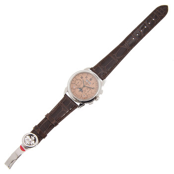 Silver-tone platinum case with a brown alligator leather strap. Fixed platinum platinum bezel. Salmon dial with platinum leaf-style shape hands and Arabic numeral hour markers. Tachymeter scale around the outer rim. Dial Type: Analog. Perpetual calendar. Chronograph - three sub-dials displaying: 60 second, 30 minute and date/moonphase. Patek Philippe Calibre CH 29-535 PS Q Hand Wind movement, containing 34 Jewels, composed of 496 parts, bitting at 28800 vph, and has a power reserve of approximately 65 hours. Scratch resistant sapphire crystal. Screw down crown. Transparent case back. Round case shape. Case size: 41 mm. Deployment clasp. Functions: perpetual calendar, moon phase, chronograph, column wheel, leap year, month, date, day, hour, minute, small second, day/night indicator. Additional Info: original box, international warranty card, manual (complete accessories). Luxury watch style. Watch label: Swiss Made. Patek Philippe Grand Complications Perpetual Chronograph Salmon Dial Men's Watch 5270P-001.
