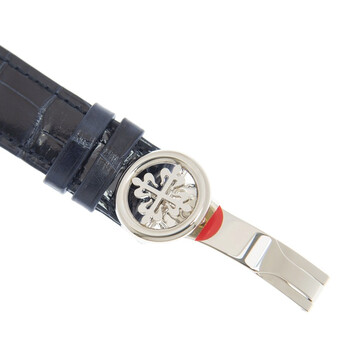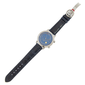 White platinum case with a blue alligator leather strap. Fixed white platinum bezel. Blue sky chart dial with silver-toned skeleton leaf-style shape hands and Arabic numeral hour markers. Date scale appears around the outer rim. Dial Type: Analog. Pointer date. One subdial displaying: moonphase. Patek Philippe Calibre 240 LU CL C Automatic movement, containing 45 Jewels, composed of 315 parts, bitting at 21600 vph, and has a power reserve of approximately 48 hours. Scratch resistant sapphire crystal. Sapphire crystal case back. Round case shape, case size: 44 mm. Tang clasp. Water resistant at 30 meters / 100 feet. Functions: hour, minute, second, date, sky chart, phases and orbit of the moon. Additional Info: displays sky chart and orbit of the moon. Grand Complications Series. Luxury watch style. Watch label: Swiss Made. Item Variations: 6102P 001, 6102P.001, 6102P001. Patek Philippe Grand Complications Platinum Men's Watch 6102P-001.