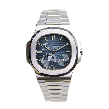 Silver-tone stainless steel case with a silver-tone stainless steel bracelet. Fixed silver-tone stainless steel bezel. Blue dial with silver-tone hands and index hour markers. Minute markers around the outer rim. Dial Type: Analog. Luminescent hands and markers. Date display at the 7 o'clock position. Three sub-dials displaying: small second, date/moonphase, power reserve indicator. Patek Philippe Calibre 240 PS IRM C LU Automatic movement, containing 29 Jewels, composed of 265 parts, bitting at 21600 vph, and has a power reserve of approximately 48 hours. Scratch resistant sapphire crystal. Fluted crown. Transparent case back. Cushion case shape, case size: 40 mm. Deployment clasp. Water resistant at 60 meters / 200 feet. Functions: moon phase, date, hour, minute, small second, power reserve indicator. Additional Info: hour/minute hands and hour markers in 18k white gold, 48-hour power reserve, date subdial at 7. Nautilus Series. Luxury watch style. Watch label: Swiss. Item Variations: 5712-1A. Patek Philippe Nautilus Automatic Blue Dial Men's Watch 5712 / 1a-001.