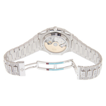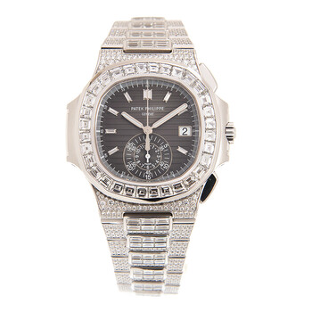 18kt white gold case with a 18kt white gold bracelet. Fixed white bezel with diamond set. Black dial with silver-tone hands and diamond index hour markers. Minute markers around the outer rim. Dial Type: Analog. Luminescent hands. Date display at the 3 o'clock position. One subdial displaying: 12 hour/60 minute. Patek Philippe Calibre CH 28-520 C Automatic movement, containing 35 Jewels, composed of 327 parts, bitting at 28800 vph, and has a power reserve of approximately 55 hours. Scratch resistant sapphire crystal. Screw down crown. Transparent case back. Cushion case shape, case size: 40.5 mm. Hidden clasp. Water resistant at 120 meters / 400 feet. Functions: chronograph, column wheel, date, hour, minute, second. Nautilus Series. Dress watch style. Watch label: Swiss Made. Patek Philippe Nautilus Automatic Diamond Black Dial Watch 5980/1400G-010.