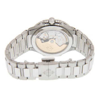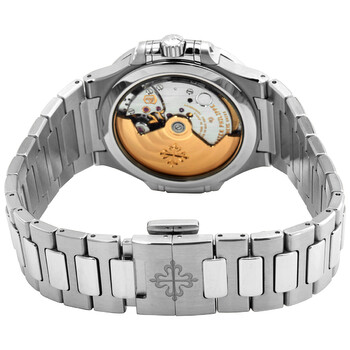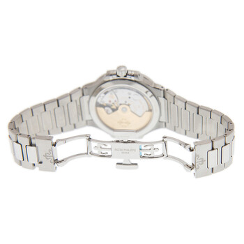 Stainless steel case with a stainless steel bracelet. Fixed stainless steel bezel set with 56 diamond (~0.67 ct.). Silver-tone dial with luminous silver-tone hands and index hour markers. An Arabic numeral appears at the 12 o'clock position. Minute markers around the outer rim. Dial Type: Analog. Luminescent hands and markers. Date display at the 6 o'clock position. Patek Philippe calibre 324 S C automatic movement, containing 29 Jewels, composed of 213 parts, bitting at 28800 vph, and has a power reserve of approximately 45 hours. Scratch resistant sapphire crystal. Screw down crown. Transparent case back. Cushion case shape. Case size: 35.2 mm. Fold over clasp. Water resistant at 60 meters / 200 feet. Functions: date, hour, minute, second. Additional Info: original box, international warranty card, manual (complete accessories). Nautilus Series. Dive watch style. Watch label: Swiss Made. Patek Philippe Nautilus Automatic Diamond Silver Dial Unisex Watch 7118-1200A-010.