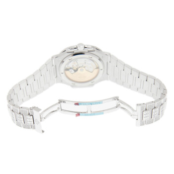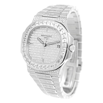 Silver-tone 18kt white gold case with a silver-tone 18kt white gold bracelet. Fixed gold-tone diamond set bezel. Silver-tone dial with gold-tone hands and n/a hour markers. Dial Type: Analog. Date display at the 3 o'clock position. Patek Philippe Calibre 324 S C Automatic movement, containing 29 Jewels, composed of 213 parts, bitting at 28800 vph, and has a power reserve of approximately 45 hours. Scratch resistant sapphire crystal. Screw down crown. Transparent case back. Round case shape. Case size: 40 mm. Deployment clasp. Water resistant at 120 meters / 400 feet. Functions: date, hour, minute, second. Additional Info: original box, international warranty card, manual (complete accessories). Case: 100 diamonds: ~0.69 ct. and 32 baguette diamonds: ~5.51 ct. Dial: fully set with 255 diamonds (~1.36 ct) and 3 baguette diamond hour markers (~0.01 ct). Bracelet: 803 diamonds: ~3.55 ct. and 150 baguette diamonds: ~7.52 ct. Total 1,343 diamonds: ~18.73 ct. Luxury watch style. Watch label: Swiss Made. Patek Philippe Nautilus Automatic Diamond Silver Dial Watch 5719-10G-010.