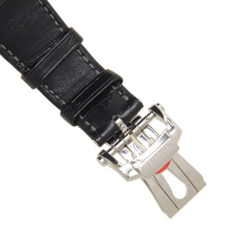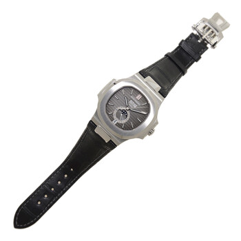 Silver-tone stainless steel case with a black crocodile leather strap. Fixed silver-tone stainless steel bezel. Black dial with luminous hands and stick hour markers. Minute markers around the outer rim. Dial Type: Analog. Luminescent hands and markers. Date display at the 6 o'clock position. day of the week and month at the 12 o'clock position. 24 hour and moonphase sub-dial at the 6 o'clock position subdials. Patek Philippe Calibre 324 S QA LU 24H/303 Automatic movement, containing 34 Jewels, composed of 347 parts, bitting at 28800 vph, and has a power reserve of approximately 45 hours. Scratch resistant sapphire crystal. Screw down crown. Skeleton case back. Cushion case shape. Case size: 40.5 mm. Fold over with safety release clasp. Water resistant at 120 meters / 400 feet. Functions: annual calendar, moon phase, month, date, day, GMT, second time zone, hour, minute, second. Luxury watch style. Watch label: Swiss Made. Patek Philippe Nautilus Automatic GMT Moonphase Black Dial Stainless Steel Men's Watch 5726A-001.