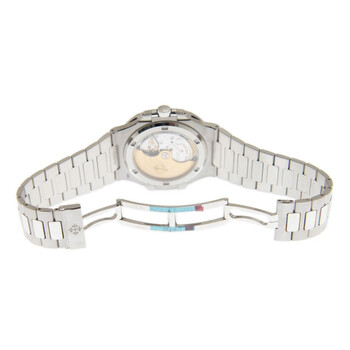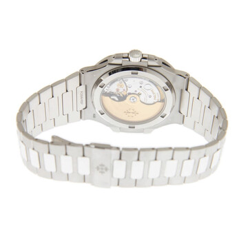 Platinum case with a silver-tone 18kt white gold bracelet. Fixed bezel with diamond set. Grey dial with silver-tone hands and diamond hour markers. Minute markers around the outer rim. Dial Type: Analog. Luminescent hands. Date display at the 3 o'clock position. Patek Philippe Calibre 26-330 S C Automatic movement, containing 30 Jewels, composed of 212 parts, bitting at 28800 vph, and has a power reserve of approximately 45 hours. Scratch resistant sapphire crystal. Screw down crown. Transparent see through case back. Cushion case shape, case size: 40 mm. Deployment with push button release clasp. Water resistant at 20 meters / 65 feet. Functions: date, hour, minute, second. Nautilus Series. Luxury watch style. Watch label: Swiss Made. Patek Philippe Nautilus Automatic Diamond Grey Dial Watch 5711-110P-001.