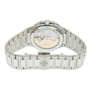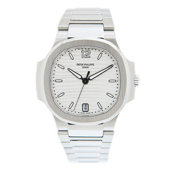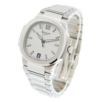 Silver-tone stainless steel case with a silver-tone stainless steel bracelet. Fixed silver-tone stainless steel bezel. White dial with silver-tone hands and gold applied hour markers and numerals with luminescent coating hour markers. Minute markers around the outer rim. Dial Type: Analog. Luminescent hands and markers. Date display at the 6 o'clock position. Patek Philippe Calibre 324 S C Automatic movement, containing 29 Jewels, composed of 213 parts, bitting at 28800 vph, and has a power reserve of approximately 45 hours. Scratch resistant sapphire crystal. Sapphire-crystal case back. Cushion case shape. Case size: 35.2 mm. Nautilus fold-over clasp. Water resistant at 60 meters / 200 feet. Functions: date, hour, minute, second. Luxury watch style. Watch label: Swiss Made. Patek Philippe Nautilus Automatic White Dial Ladies Watch 7118/1A-010.