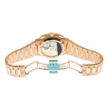 18kt rose gold case with a gold-tone 18kt rose gold bracelet. Fixed 18kt rose gold bezel. Blue dial with index hour markers. Dial Type: Analog. Date display at the 12 o'clock position. Two sub-dials displaying: 60 second and date. Patek Philippe Calibre CH 28-520 C FUS Automatic movement, containing 34 Jewels, composed of 370 parts, bitting at 28800 vph, and has a power reserve of approximately 55 hours. Scratch resistant sapphire crystal. Screw down crown. Transparent see through case back. Case size: 40.5, case thickness: 12.53. Deployment clasp. Water resistant at 120 meters / 400 feet. Functions: chronograph, column wheel, date, second time zone, hour, minute, small second, day/night indicator. Additional Info: original box, international warranty card, manual (complete accessories). Nautilus Series. Luxury watch style. Watch label: Swiss Made. Patek Philippe Nautilus Chronograph Automatic Blue Dial Men's Watch 5990-1R-001.