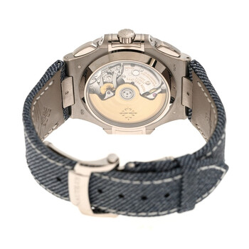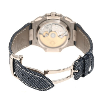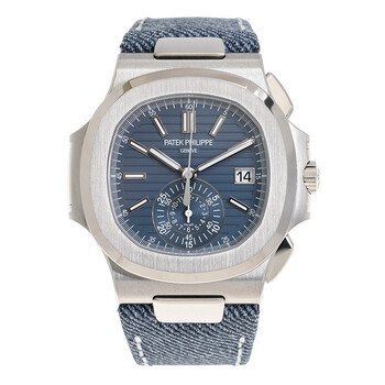 18kt white gold case with a denim blue-gray calfskin band. Fixed silver-tone bezel. Blue-gray dial with silver-tone hands and index hour markers. Minute scale around the inner rim. Dial Type: Analog. Luminescent hands and markers. Date display at the 3 o'clock position. Chronograph - two sub-dials displaying: 12 hour and 60 minutes & 30 seconds. Patek Philippe Calibre CH 28-520 C/522 automatic movement with a 45-hour power reserve. Scratch resistant sapphire crystal. Screw down crown. Transparent see through case back. Cushion case shape, case size: 40.5 mm, case thickness: 12.2 mm. Fold over clasp with a safety release. Water resistant at 30 meters / 100 feet. Functions: chronograph, date, hour, minute, second. Nautilus Series. Luxury watch style. Watch label: Swiss Made. Patek Philippe Nautilus Chronograph Automatic Men's Watch 5980-60G-001.