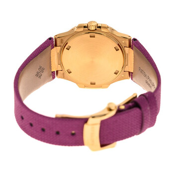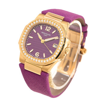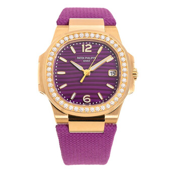 Rose gold case with a purple fabric strap. Fixed rose gold-tone bezel with diamond set. Purple dial with rose gold-tone hands and index-Arabic numeral hour markers. Dial Type: Analog. Luminescent hands and markers. Date display at the 3 o'clock position. Patek Philippe Calibre E 23-250 S C quartz movement. Scratch resistant sapphire crystal. Solid case back. Octagonal case shape, case size: 32 mm, case thickness: 6.9 mm. Fold-over clasp. Water resistant at 60 meters / 197 feet. Functions: hour, minute, second. Nautilus Series. Luxury watch style. Watch label: Swiss Made. Patek Philippe Nautilus Quartz Diamond Purple Dial Ladies Watch 7010R.
