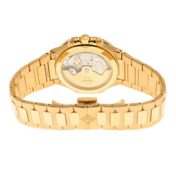 18kt rose gold case and bracelet. Fixed 18kt rose gold bezel. Rose-gilt dial with rose gold-tone hands and spessartites hour markers. Minute markers around the outer rim. Dial Type: Analog. Date display at the 6 o'clock position. Patek Philippe Calibre 324 S C Automatic movement, containing 29 Jewels, composed of 213 parts, bitting at 28800 vph, and has a power reserve of approximately 45 hours. Scratch resistant sapphire crystal. Transparent case back. Cushion case shape, case size: 35.2 mm, case thickness: 8.62 mm. Fold-over clasp. Water resistant at 60 meters / 200 feet. Functions: date, hour, minute, second. Additional Info: 68 baguette-cut spessartites, "champagne" to "cognac" tones: 2.04 cts. (bezel). total of 79 spessartites (2.38 cts). Nautilus Series. Luxury watch style. Watch label: Swiss Made. Patek Philippe Nautilus Rose Gold Automatic Rose Dial Ladies Watch 7118-1300R-001.