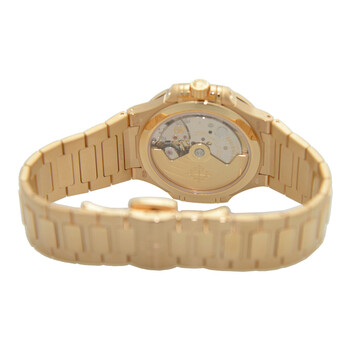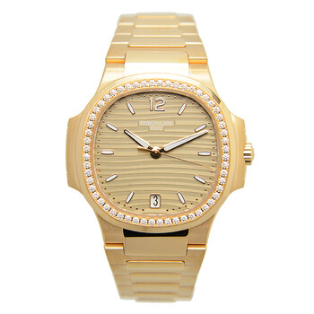 18 carat rose gold case with a rose gold bracelet bracelet. 56 diamonds (~0.67 ct) bezel. Golden brown opaline dial with gold applied hour markers and numerals with luminescent coating hour markers. Dial Type: Analog. Luminescent hands and markers. Date display at the 6 o'clock position. Patek Philippe Calibre 324 S C automatic movement with about 45 hours of power reserve. Scratch resistant sapphire crystal. Sapphire-crystal case back. Case size: 35.2. Cushion case shape. Nautilus fold-over clasp. Water resistant at 60 meters / 200 feet. Functions: date, hour, minute, second. Luxury watch style. Watch label: Swiss Made. Patek Philippe Nautilus Rose Gold Ladies Watch Ladies 7118-1200R-010.