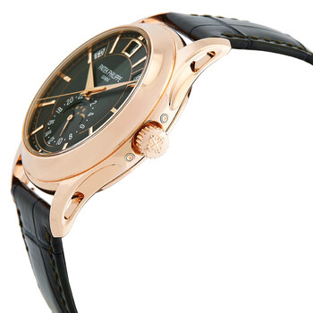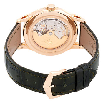 Rose gold case with a alligator leather strap. Fixed rose gold bezel. Olive green sunburst dial with rose gold hands and index hour markers. Dial Type: Analog. Date display at the 12 o'clock position. One subdial displaying: one- moonphase. Patek Philippe Calibre 324 S QA LU 24H/206 Automatic movement, containing 34 Jewels, composed of 356 parts, bitting at 28800 vph, and has a power reserve of approximately 45 hours. Scratch resistant sapphire crystal. Transparent see through case back. Round case shape, case size: 40 mm, case thickness: 11.36 mm. Prong clasp. Water resistant at 30 meters / 100 feet. Functions: hour, minute, second, annual calendar. Complications Series. Luxury watch style. Watch label: Swiss Made. Patek Philippe Complications Automatic Men's Rose Gold Watch 5205R-011.