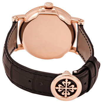 18kt rose gold case with a brown crocodile leather strap. Fixed 18kt rose gold bezel. White opaline dial with black-toned spade-shaped hands and Roman numeral hour markers. Minute markers around the outer rim. Dial Type: Analog. Perpetual calendar. One subdial displaying: moonphase. Patek Philippe Calibre 324 S QR Automatic movement, containing 30 Jewels, composed of 361 parts, bitting at 28800 vph, and has a power reserve of approximately 45 hours. Scratch resistant sapphire crystal. Pull / push crown. Solid case back. Round case shape, case size: 38 mm, case thickness: 11.79 mm. Deployment clasp. Water resistant at 30 meters / 100 feet. Functions: perpetual calendar, moon phase, leap year, date, day, hour, minute, second. Perpetual Calendar Series. Luxury watch style. Watch label: Swiss Made. Item Variations: 5159R 001, 5159R.001, 5159R001. Patek Philippe Perpetual Calendar 18kt Rose Gold Brown Leather Men's Watch 5159R-001.