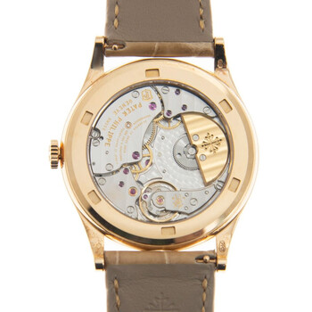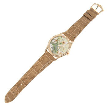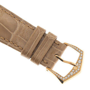 18kt rose gold case with a brown alligator band. Fixed bezel with diamond set. Brown dial. Dial Type: Analog. Patek Philippe Calibre 240 Automatic movement, containing 27 Jewels, composed of 161 parts, bitting at 21600 vph, and has a power reserve of approximately 48 hours. Scratch resistant sapphire crystal. Transparent see through case back. Round case shape, case size: 43 mm. Tang clasp. Functions: hour, minute. Rare Handcrafts Series. Luxury watch style. Watch label: Swiss Made. Patek Philippe Rare Handcrafts Automatic Diamond Brown Dial Watch 5077-100R-036. The bezel and lugs are set with 112 brilliant-cut Top Wesselton Pure diamonds (~0.8 ct) and the prong buckle sparkles with 29 diamonds (~0.22 ct). Housed in a white-gold or rose-gold case, the caliber 240 ultra-thin self-winding movement may be admired through the sapphire-crystal back.