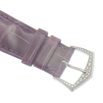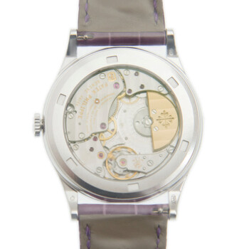 18kt white gold case with a purple leather strap. Fixed 18kt white gold diamond set bezel. Purple dial with white dauphine-style shape hands. Dial Type: Analog. Patek Philippe Calibre 240 Automatic movement, containing 27 Jewels, composed of 161 parts, bitting at 21600 vph, and has a power reserve of approximately 48 hours. Scratch resistant sapphire crystal. Transparent case back. Round case shape. Case size: 37 mm. Tang clasp. Functions: hour, minute. Additional Info: original box, international warranty card, manual (complete accessories). Luxury watch style. Watch label: Swiss Made. Patek Philippe Rare Handcrafts Hummingbirds Diamond Purple Dial Unisex Watch 5077-100G-025.