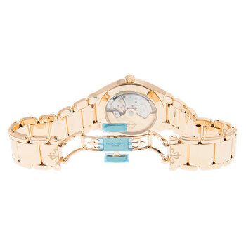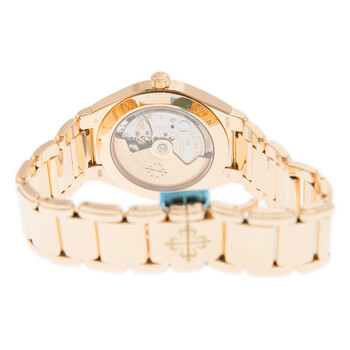 18kt rose gold case and bracelet. Fixed 18kt rose gold bezel set with 160 diamonds (0.77 ct). White dial with luminous rose gold-tone baton-style hands and Arabic numeral hour markers. Minute markers around the outer rim. Dial Type: Analog. Luminescent hands. Date display at the 6 o'clock position. Patek Philippe calibre 324 S C automatic movement, containing 29 Jewels, composed of 213 parts, bitting at 28800 vph, and has a power reserve of approximately 45 hours. Scratch resistant sapphire crystal. Screw down crown. Transparent case back. Round case shape. Case size: 36 mm. Case thickness: 10.05 mm. Deployment clasp. Water resistant at 30 meters / 100 feet. Functions: date, hour, minute, second. Additional Info: original box, international warranty card, manual (complete accessories). Luxury watch style. Watch label: Swiss Made. Patek Philippe Twenty-4 18kt Rose Gold Automatic Diamond White Dial Ladies Watch 7300-1200R-010.