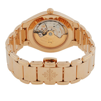 18kt rose gold case with a 18kt rose gold bracelet. Fixed 18kt rose gold bezel set with diamonds. Rose gold-tone dial with rose gold-tone hands and Arabic numeral hour markers. Minute markers around the outer rim. Dial Type: Analog. Luminescent hands and markers. Date display at the 6 o'clock position. Patek Philippe calibre 324 S C automatic movement, containing 29 Jewels, composed of 213 parts, bitting at 28800 vph, and has a power reserve of approximately 45 hours. Scratch resistant sapphire crystal. Transparent see through case back. Round case shape. Case size: 36 mm. Deployment clasp with a push button release clasp. Water resistant at 30 meters / 100 feet. Functions: date, hour, minute, second. Additional Info: original box, manual (complete accessories). Twenty-4 Series. Luxury watch style. Watch label: Swiss Made. Patek Philippe Twenty-4 Automatic Diamond Rose Gold Dial Ladies Watch 7300-1200R-011.