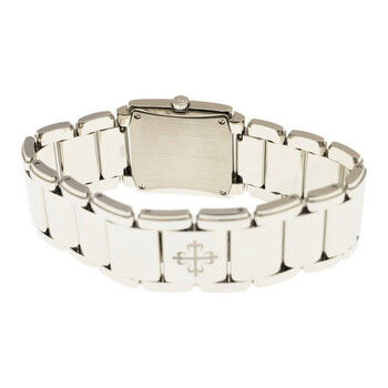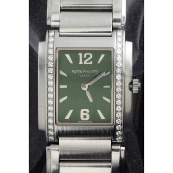 Silver-tone stainless steel case and bracelet. Fixed silver-tone bezel with diamond set. Olive green sunburst dial with silver-tone hands and index-Arabic numeral hour markers. Patek Philippe Calibre E 15 quartz movement. Solid case back. Rectangle case shape, case size: 25.1 x 30 mm. Fold over clasp with a safety release. Water resistant at 30 meters / 100 feet. Functions: hour, minute. Additional Info: 36 diamonds : ~0.42 ct. (case). Twenty~4 Series. Dress watch style. Patek Philippe Twenty~4 Quartz Diamond Ladies Watch 4910-1200A-011.