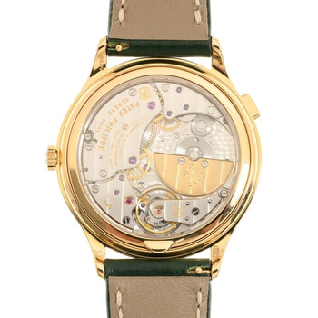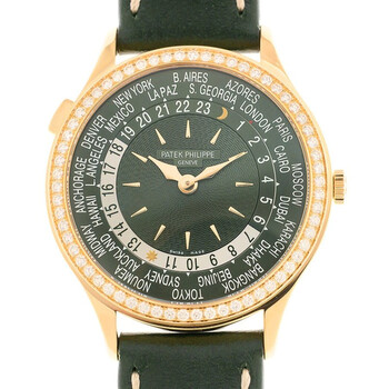 Rose gold-tone 18kt rose gold case with a green leather strap. 18kt rose gold rose gold-tone bezel with crystal set. Olive green dial with gold-tone hands and index hour markers. Dial Type: Analog. One subdial displaying: moonphase. Patek Philippe Calibre 240 HU LU Automatic movement, based upon 240 HU, containing 35 Jewels, composed of 270 parts, bitting at 21600 vph, and has a power reserve of approximately 48 hours. Scratch resistant sapphire crystal. Round case shape, case size: 36 mm, case thickness: 8.83 mm. Buckle clasp. Water resistant at 30 meters / 100 feet. Functions: moon phase, world time, GMT, hour, minute, day/night indicator. Additional Info: bezel set with 62 diamonds (~0.82 ct). prong buckle set with 27 diamonds (~0.21 ct.). Dress watch style. Watch label: Swiss Made. Patek Philippe World Time Automatic Crystal Men's Watch 7130R-014.