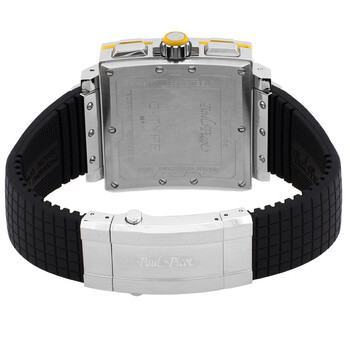 Silver-tone stainless steel case with a black rubber strap. Fixed silver-tone stainless steel bezel. Black dial with silver-tone hands and index hour markers. Minute markers around the outer rim. Dial Type: Analog. Luminescent hands and markers. Date display between 4 and 5 o'clock position. ETA Caliber 2892 Automatic movement, containing 21 Jewels, bitting at 28800 vph, and has a power reserve of approximately 42 hours. Scratch resistant sapphire crystal. Screw down crown. Solid case back. Square case shape, case size: 42 mm, case thickness: 14 mm. Band width: 25 mm, band length: 8 inches. Deployment with push button release clasp. Water resistant at 100 meters / 330 feet. Functions: date, hour, minute, second. Additional Info: hours, minutes, small seconds, chronograph, date. C-type Series. Luxury watch style. Watch label: Swiss Movt. Paul Picot C-Type Automatic Black Dial Men's Watch P0830.SG.5010.3301.