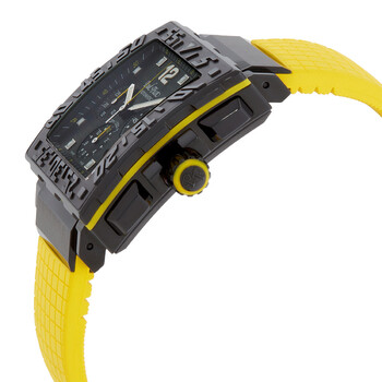 Black stainless steel case with a yellow rubber strap. Fixed black stainless steel bezel. Black dial with silver-tone hands and index hour markers. Minute markers around the outer rim. Dial Type: Analog. Luminescent hands and markers. Date display between 4 and 5 o'clock position. ETA Caliber 2892 Automatic movement, containing 21 Jewels, bitting at 28800 vph, and has a power reserve of approximately 42 hours. Scratch resistant sapphire crystal. Screw down crown. Solid case back. Square case shape, case size: 42 mm, case thickness: 14 mm. Band width: 25 mm, band length: 8 inches. Deployment with push button release clasp. Water resistant at 100 meters / 330 feet. Functions: date, hour, minute, second. Additional Info: hours, minutes, small seconds, chronograph, date. C-type Series. Luxury watch style. Watch label: Swiss Movt. Paul Picot C-Type Automatic Black Dial Men's Watch P0830.SGN.5601.3302.