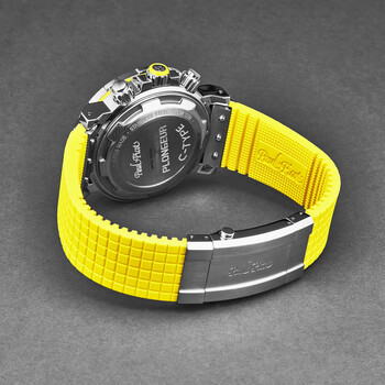 Silver-tone stainless steel case with a yellow rubber strap. Uni-directional rotating silver-tone stainless steel bezel. Black dial with silver-tone hands and index hour markers. Minute markers around the outer rim. Dial Type: Analog. Luminescent hands and markers. Between the 4 and 5 o'clock position. Chronograph - three sub-dials displaying: 60 second, 30 minute and 12 hour. Calibre PP 1600 (ETA 7750 base) automatic movement. Scratch resistant sapphire crystal. Solid case back. Round case shape, case size: 43 mm, case thickness: 16 mm. Band width: 22 mm, band length: 8 inches. Deployment with push button release clasp. Water resistant at 300 meters / 1000 feet. Functions: chronograph, date, hour, minute, second. Additional Info: hours, minutes, small seconds, chronograph, date. C-type Series. Luxury watch style. Watch label: Swiss Made. Paul Picot C-Type Chronograph Automatic Black Dial Men's Watch P4116.20GR.563CM061.