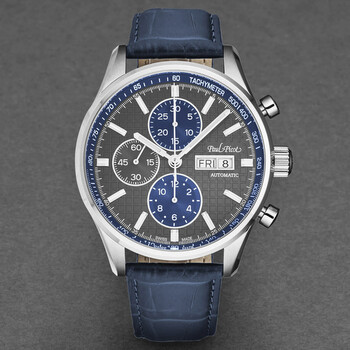 Silver-tone stainless steel case with a blue leather strap. Fixed silver-tone stainless steel bezel. Grey dial with silver-tone hands and index hour markers. Minute markers around the outer rim. Dial Type: Analog. Luminescent hands and markers. Day of the week and date display at the 3 o'clock position. Paul Picot Calibre PP4160 automatic movement. Scratch resistant sapphire crystal. Transparent case back. Round case shape, case size: 42 mm, case thickness: 15 mm. Band width: 21 mm, band length: 8 inches. Tang clasp. Water resistant at 50 meters / 165 feet. Functions: chronograph, day, date, hour, minute, second. Additional Info: la joux-perret l100 roue à colonne. Gentleman Blazer Series. Luxury watch style. Watch label: Swiss Made. Paul Picot Gentleman Blazer Chronograph Automatic Grey Dial Men's Watch P4309.SG.1131.8614.