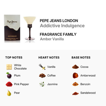 At first spray, Addictive Indulgence delights with a delicious blend of white chocolate, ripe plum, pink pepper, and juicy pear. These top notes create a sweet and slightly spicy opening that’s both playful and inviting. As the fragrance settles, warm vanilla, rich coffee, and soft jasmine take center stage, adding depth and elegance. Finally, the base notes of smooth cocoa, amberwood, benzoin, and creamy sandalwood wrap around you like a cozy cashmere scarf, leaving a lasting impression that lingers beautifully on the skin.
