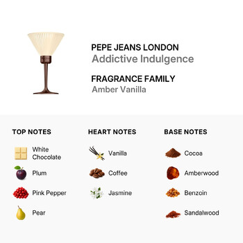From the very first spritz, Addictive Indulgence awakens your senses with an enchanting mix of white chocolate, juicy plum, pink pepper, and crisp pear. As the fragrance settles, a heart of creamy vanilla, rich coffee, and soft jasmine adds depth and warmth. The base notes of velvety cocoa, amberwood, benzoin, and sandalwood wrap everything together, creating a long-lasting trail that's smooth and sophisticated.