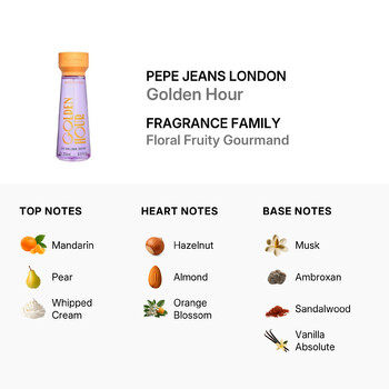 Step into your moment with the warm, captivating scent of Golden Hour by Pepe Jeans London. This ladies’ mist, launched in 2025, captures the magic of twilight with a beautiful blend of floral, fruity, and gourmand notes that awaken your senses and leave a lasting impression. Designed for women who want to feel radiant and unforgettable, Golden Hour is your perfect accessory for day or night.