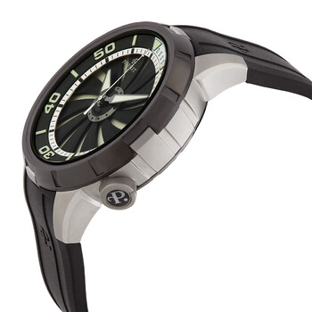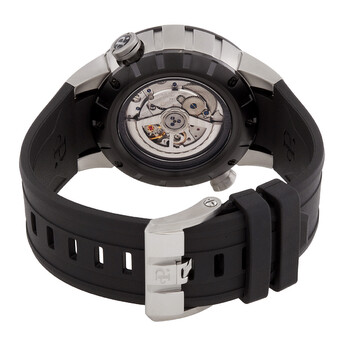 DLC treated stainless steel case with a black rubber strap. Fixed bezel. Black and superluminova dial with luminous hands and index hour markers. Minute markers around the outer rim. Dial Type: Analog. Automatic movement. Scratch resistant sapphire crystal. Case diameter: 47.5 mm. Round case shape. Water resistant at 300 meters / 1000 feet. Functions: hour, minute, second. Luxury watch style. Perrelet Turbine Black Superluminova Dial Automatic Men's Watch A1067-1.