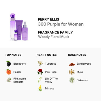 This 4-piece gift set includes everything needed to layer and enjoy the fragrance all day long. It features a 3.4 oz Eau De Parfum Spray, a 3.0 oz Shower Gel, a 4.0 oz Body Mist, and a matching gift box—making it a perfect choice for birthdays, holidays, or just because. With its sophisticated blend of notes and elegant packaging, Perry Ellis 360 Purple for Women is a must-have addition to any fragrance collection.