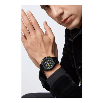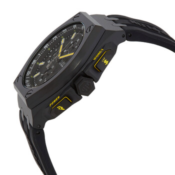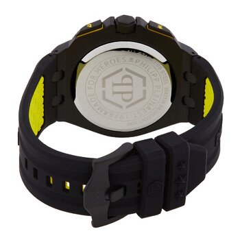 Black IP stainless steel case with a black silicone strap. Fixed black IP stainless steel bezel. Black dial with black hands and index hour markers. Minute markers around the outer rim. Dial Type: Analog. Luminescent hands and markers. Date display at the 3 o'clock position. Chronograph - three sub-dials displaying: 60 second, 60 minute and 1/10th of a second. Quartz movement. Scratch resistant mineral crystal. Solid case back. Round case shape, case size: 44 mm, case thickness: 13 mm. Band width: 27 mm. Buckle clasp. Water resistant at 50 meters / 165 feet. Functions: chronograph, date, hour, minute, second. Plein Extreme Series. Dress watch style. Philipp Plein Extreme Chronograph Quartz Black Dial Men's Watch PWGAA0221.