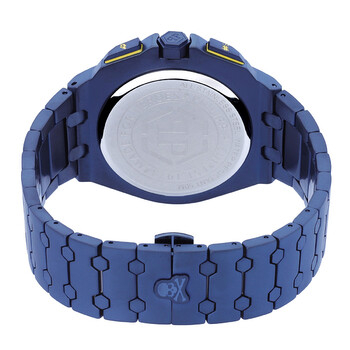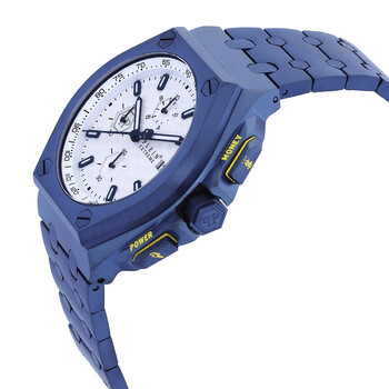 Blue IP stainless steel case and bracelet. Fixed blue IP stainless steel bezel. White dial with blue hands and index hour markers. Minute markers around the outer rim. Dial Type: Analog. Luminescent hands and markers. Date display at the 3 o'clock position. Chronograph - three sub-dials displaying: 60 second, 60 minute and 1/10th of a second. Quartz movement. Scratch resistant mineral crystal. Solid case back. Round case shape, case size: 44 mm, case thickness: 13 mm. Band width: 27 mm. Fold over clasp with a safety release. Water resistant at 50 meters / 165 feet. Functions: chronograph, date, hour, minute, second. Plein Extreme Series. Dress watch style. Philipp Plein Extreme Chronograph Quartz White Dial Men's Watch PWGAA0721.