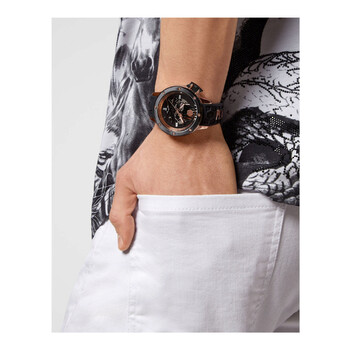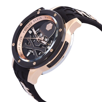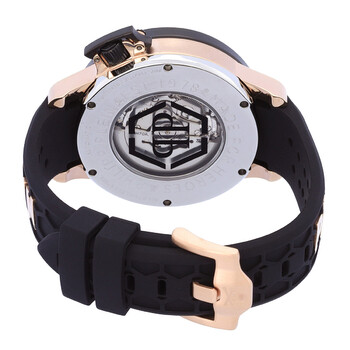 Rose gold-tone stainless steel case with a black silicone strap. Fixed black stainless steel bezel. Black dial with rose gold-tone hands and index hour markers. Dial Type: Analog. Automatic movement. Scratch resistant mineral crystal. Transparent case back. Round case shape, case size: 46 mm. Buckle clasp. Water resistant at 50 meters / 165 feet. Functions: hour, minute, second. Hyper Sport Series. Sport watch style. Philipp Plein Hyper Sport Automatic Black Dial Men's Watch PWUAA0623.