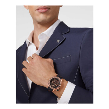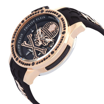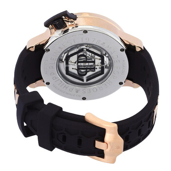 Rose gold-tone stainless steel case with a black silicone strap. Fixed rose gold-tone bezel with crystal set. Black dial with rose gold-tone hands. Dial Type: Analog. Automatic movement. Scratch resistant mineral crystal. Transparent case back. Round case shape, case size: 46 mm, case thickness: 14.5 mm. Band width: 20 mm. Buckle clasp. Water resistant at 50 meters / 165 feet. Functions: hour, minute, second. Hyper Sport Series. Casual watch style. Philipp Plein Hyper Sport Automatic Crystal Black Dial Men's Watch PWUAA0323.