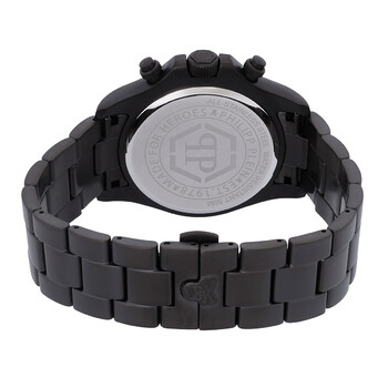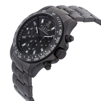Black stainless steel case and bracelet. Fixed black stainless steel bezel. Black dial with black hands and crystal hour markers. Minute markers around the outer rim. Dial Type: Analog. Chronograph - three sub-dials displaying: 60 second, 60 minute and 24 hour. Quartz movement. Scratch resistant mineral crystal. Solid case back. Round case shape, case size: 43 mm, case thickness: 14 mm. Band width: 22 mm. Deployment with push button release clasp. Water resistant at 50 meters / 165 feet. Functions: chronograph, hour, minute, second. Nobile Series. Sport watch style. Philipp Plein Nobile Chronograph Quartz Crystal Black Dial Men's Watch PWCAA0621.