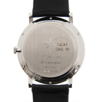 18kt white gold case with a black satin strap. Fixed 18kt white gold diamond set bezel. Black dial with white hands. Dial Type: Analog. Piaget Calibre 430P hand wind movement with a 43-hour power reserve. Scratch resistant sapphire crystal. Pull / push crown. Solid case back. Round case shape. Case size: 38 mm. Tang clasp. Water resistant at 30 meters / 100 feet. Functions: hour, minute. Additional Info: limited to 38 pieces. Luxury watch style. Watch label: Swiss Made. Piaget Altiplano Diamond Black Dial Unisex Watch G0A38574.