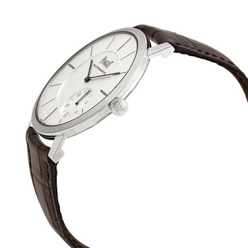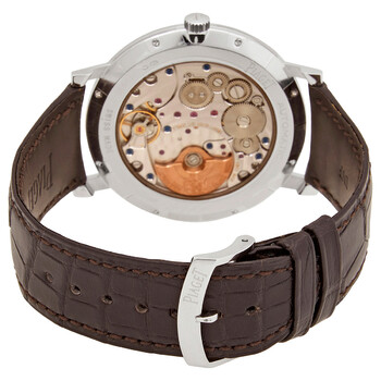 18kt white gold case with a brown (alligator) leather strap. Fixed 18kt white gold bezel. Silver dial with black hands. Dial Type: Analog. Small seconds sub-dial. Piaget calibre 1208P Automatic movement, containing 27 Jewels, composed of 191 parts, bitting at 21600 vph, and has a power reserve of approximately 44 hours. Scratch resistant sapphire crystal. Transparent sapphire case back. Round case shape. Case size: 43 mm. Case thickness: 5.25 mm. Band width: 16 mm. Tang clasp. Water resistant at 20 meters / 65 feet. Functions: hour, minute, small second. Luxury watch style. Watch label: Swiss Made. Piaget Altiplano Automatic Silver Dial Black Leather Men's Watch G0A35130.