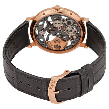 18kt rose gold case with a Grey (alligator) leather strap. Fixed 18kt rose gold bezel. Skeleton dial with rose gold hands. No markers. Dial Type: Analog. Piaget calibre 1200S automatic movement, based upon Piaget 1200P, containing 26 Jewels, composed of 189 parts, bitting at 21600 vph, and has a power reserve of approximately 44 hours. Scratch resistant sapphire crystal. Pull / push crown. Transparent case back. Round case shape. Case size: 38 mm. Case thickness: 5.34 mm. Tang clasp. Water resistant at 30 meters / 100 feet. Functions: hour, minute. Altiplano Series. Luxury watch style. Watch label: Swiss Made. Item Variations: GOA38132, G0A38132, 38132. Piaget Altiplano Automatic Skeleton Dial Men's Watch G0A38132.