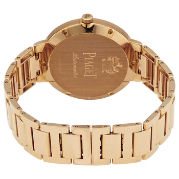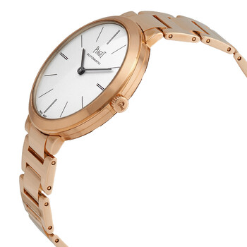 18kt rose gold case and bracelet. Fixed 18kt rose gold bezel. White dial with black hands and index hour markers. Dial Type: Analog. Piaget Calibre 534P Automatic movement, based upon Piaget 500P, containing 25 Jewels, composed of 196 parts, bitting at 21600 vph, and has a power reserve of approximately 42 hours. Scratch resistant sapphire crystal. Screw down crown. Solid case back. Round case shape, case size: 34 mm, case thickness: 7.8 mm. Band width: 14 mm. Fold over clasp with a safety release. Water resistant at 30 meters / 100 feet. Functions: hour, minute. Altiplano Series. Luxury watch style. Watch label: Swiss Made. Item Variations: GOA40105, G0A40105, 40105. Piaget Altiplano Automatic White Dial 18kt Rose Gold Ladies Watch G0A40105.