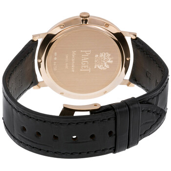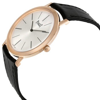 18kt rose gold case with a black leather strap. Fixed 18kt rose gold bezel. Silver dial with black hands and index hour markers. Dial Type: Analog. Piaget caliber 430P hand wind movement with a 43-hour power reserve. Scratch resistant sapphire crystal. Pull / push crown. Solid case back. Case size: 38 mm. Case thickness: 6.4 mm. Round case shape. Tang clasp. Water resistant at 30 meters / 100 feet. Functions: hour, minute. Additional Info: hand wound ultra thin movement. index markers. Luxury watch style. Watch label: Swiss Made. Item Variations: GOA31114 , A31114 , 31114. Piaget Altiplano Mechanical Silver Dial Leather Men's Watch G0A31114.
