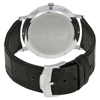 18 carat white gold case with a black alligator leather strap. Fixed bezel. Black dial with silver-tone hands and index hour markers. Dial Type: Analog. Mechanical movement. 430P engine. Scratch resistant sapphire crystal. Case diameter: 38 mm. Case thickness: 6 mm. Round case shape. Folding clasp. Water resistant at 30 meters / 100 feet. Functions: hour, minute. Luxury watch style. Watch label: Swiss Made. Piaget Altiplano Mechanical Black Dial 18Kt White Gold Men's Watch GOA29113.