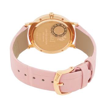 18kt rose gold case with a pink alligator leather strap. Fixed 18kt rose gold bezel set with 72 brilliant-cut diamonds (approx. 0.52 ct). Pink mother of pearl dial with rose gold hands and index hour markers. Dial Type: Analog. Piaget Calibre 430P Hand Wind movement, containing 18 Jewels, composed of 131 parts, bitting at 21600 vph, and has a power reserve of approximately 43 hours. Scratch resistant sapphire crystal. Round case shape, case size: 34 mm, case thickness: 6.5 mm. Ardillon buckle clasp. Water resistant at 30 meters / 100 feet. Functions: hour, minute. Additional Info: limited edition of 300. Altiplano Origin Series. Luxury watch style. Watch label: Swiss Made. Piaget Altiplano Origin Hand Wind Diamond Ladies Watch G0A44060.