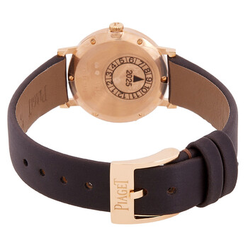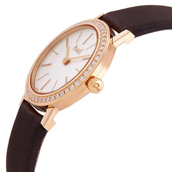 18kt rose gold case with a brown satin strap. Fixed 18kt rose gold bezel set with 48 brilliant-cut diamonds (approx. 0.35 ct). White dial with rose gold-tone hands and index hour markers. Dial Type: Analog. Piaget Calibre 690P quartz movement. Scratch resistant sapphire crystal. Pull / push crown. Solid case back. Round case shape, case size: 24 mm, case thickness: 5.4 mm. Ardillon buckle clasp. Water resistant at 30 meters / 100 feet. Functions: hour, minute. Altiplano Series. Luxury watch style. Piaget Altiplano Quartz Diamond White Dial Ladies Watch G0A44534.