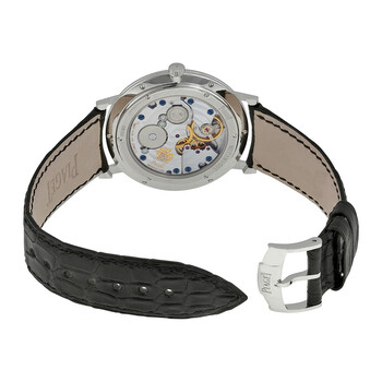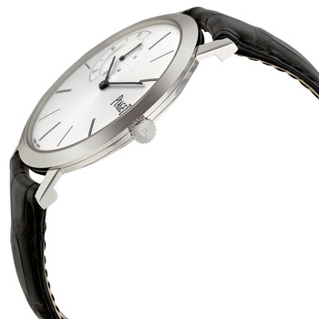 18kt white gold case with a black (alligator) leather strap. Fixed 18kt white gold bezel. Silver dial with black hands and index hour markers. Dial Type: Analog. Small seconds sub-dial at the 10 o'clock position. Mechanical movement with a 61 hour power reserve. Scratch resistant sapphire crystal. Pull / push crown. Skeleton case back. Case diameter: 40 mm. Case thickness: 6.6 mm. Round case shape. Tang clasp. Water resistant at 30 meters / 100 feet. Functions: hour, minute, small second. Luxury watch style. Watch label: Swiss Made. Piaget Altiplano Silver Dial Black Leather Automatic Men's Watch G0A33112.